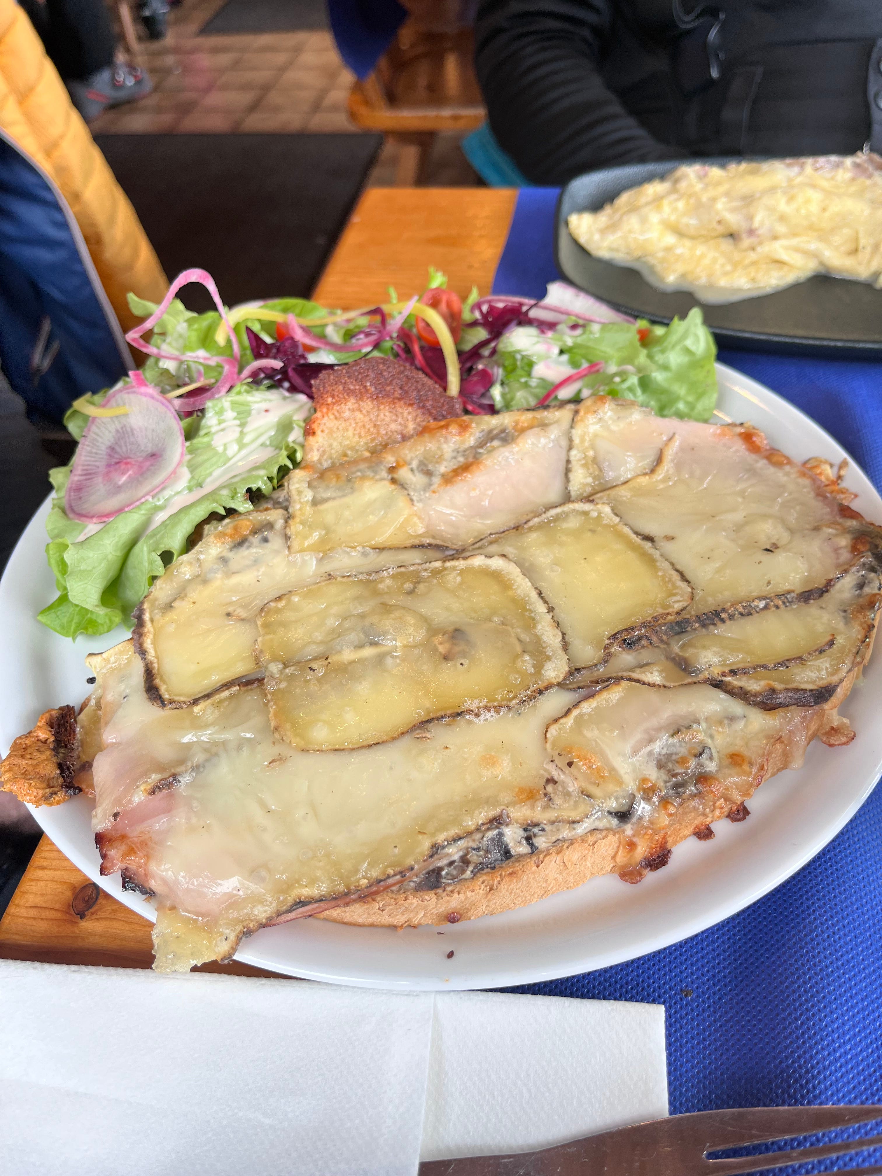 In terms of eating this week we had much cheese, potatoes and ham in the Savoyard places in Avoriaz, Montriond and Morzine, including a spectacular Tartiflette in the village at Abricotines. Buttons Junior had what was loosely described as une croute or toasted sandwich, which ended up being a slice of bread fit for the Flintstones, a large amount of a ham and then several kilos of cheese melted over the top; unsurprisingly he finished the whole thing. There were the normal temptations of Raclette and various fondues, but at lunchtime when skiing it seems both decadent and self-defeating. We did try out various of the Mont Blanc brewery beers, the Ambrée or red, the normal lager or Blonde, their IPA and Poireaux Junior bravely selected the Myrtille which we all agreed tasted like Ribena. I did one of the Green or Genepi variants and that was palatable, a taste of juniper without it tasting completely like cough medicine. We also managed to get a visit in to ‘Ibex’, the microbrewery in Montriond, the beer was great even if the setting in an industrial estate was not the most picturesque, it was full of the local ski workers, which showed it was good value. Italy was a shift in tone food wise. More pasta and of course every restaurant must offer pizza, just in case it misses out on the tourist’s slavery to the dish. The food seemed typical Italian rather than mountain specific offers, but I will be honest the sample size was small. What we did enjoy was the early evening drinks in the center of the old town of Courmayeur, everyone people watching the “passegiata”, and you get a thoughtful selection of foccacia, cheese and ham with your drinks.